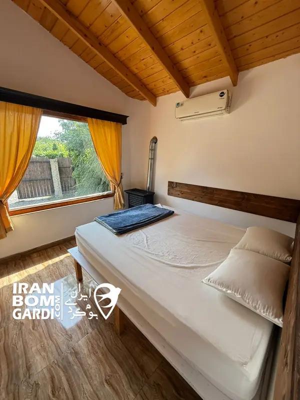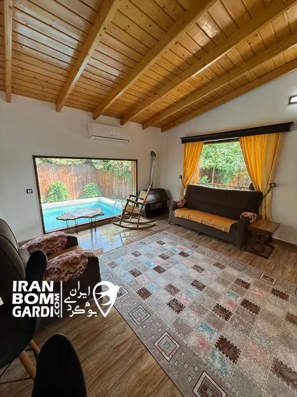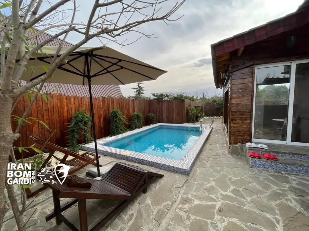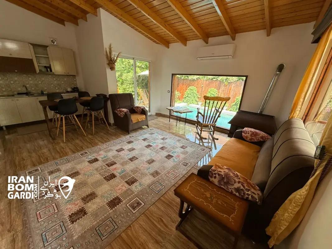 کلبه با زیربنای 80 متر شامل اتاق پذیرایی (مبلمان، تلویزیون و میز غذاخوری)، 2 اتاق خواب (2 تخت دبل)، امکانات آشپزی (یخچال، اجاق گاز، سینک ظرفشویی، سیخ کباب، ظروف غذاخوری و ظروف طبخ غذا)، استخر روباز آبگرم، تراس، باربیکیو، سیستم گرمایشی بخاری گازی، سیستم سرمایشی کولر اسپلیت، سرویس بهداشتی ایرانی- فرنگی و حمام اختصاصی.