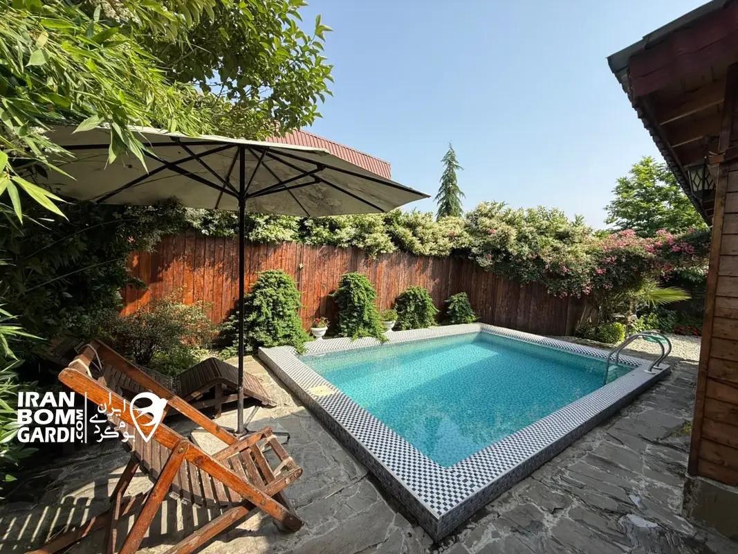ویلا دارای استخر روباز مجهز به آبگرم در حیاط می باشد. فاصله کلبه تا سوپرمارکت 100 متر و نانوایی 200 متر می باشد.