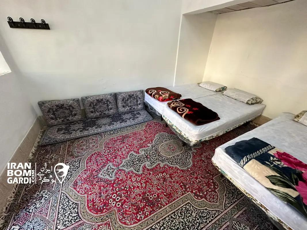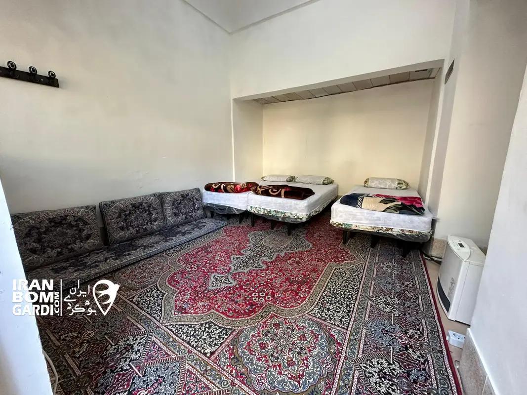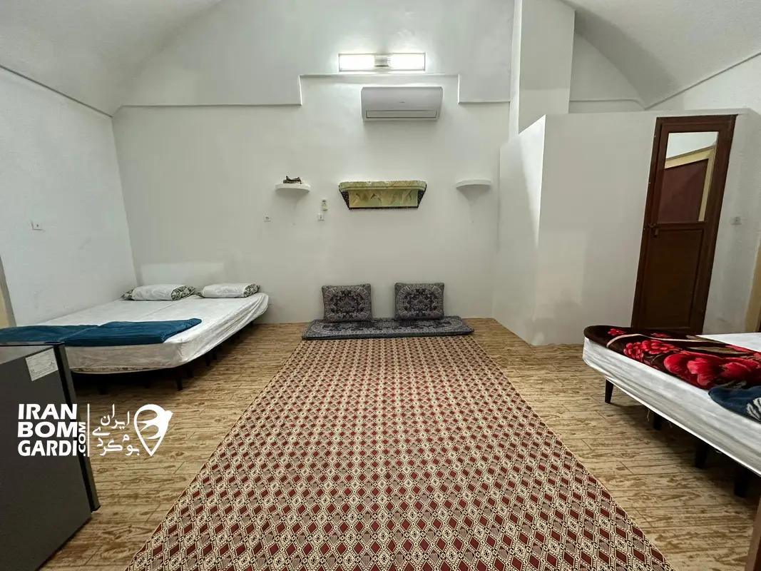 اتاق با زیربنای 15 متر شامل 1 تخت توئین، 1 تخت سینگل، یخچال، سیستم گرمایشی بخاری گازی، سیستم سرمایشی کولر اسپلیت، سرویس بهداشتی ایرانی و حمام مشترک در محوطه.