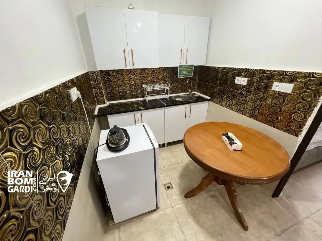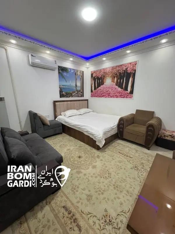 سوئیت با زیربنای 45 متر در طبقه همکف شامل اتاق (1 تخت دبل، کاناپه تخت شو و تلویزیون)، آشپزخانه با امکانات (یخچال، اجاق گاز، چای ساز، سینک ظرفشویی، ظروف غذاخوری و ظروف پخت و پز)، سیستم گرمایشی شوفاژ، سیستم سرمایشی کولر اسپلیت، سرویس بهداشتی فرنگی و حمام اختصاصی در سوئیت، سرویس بهداشتی ایرانی مشترک در محوطه.