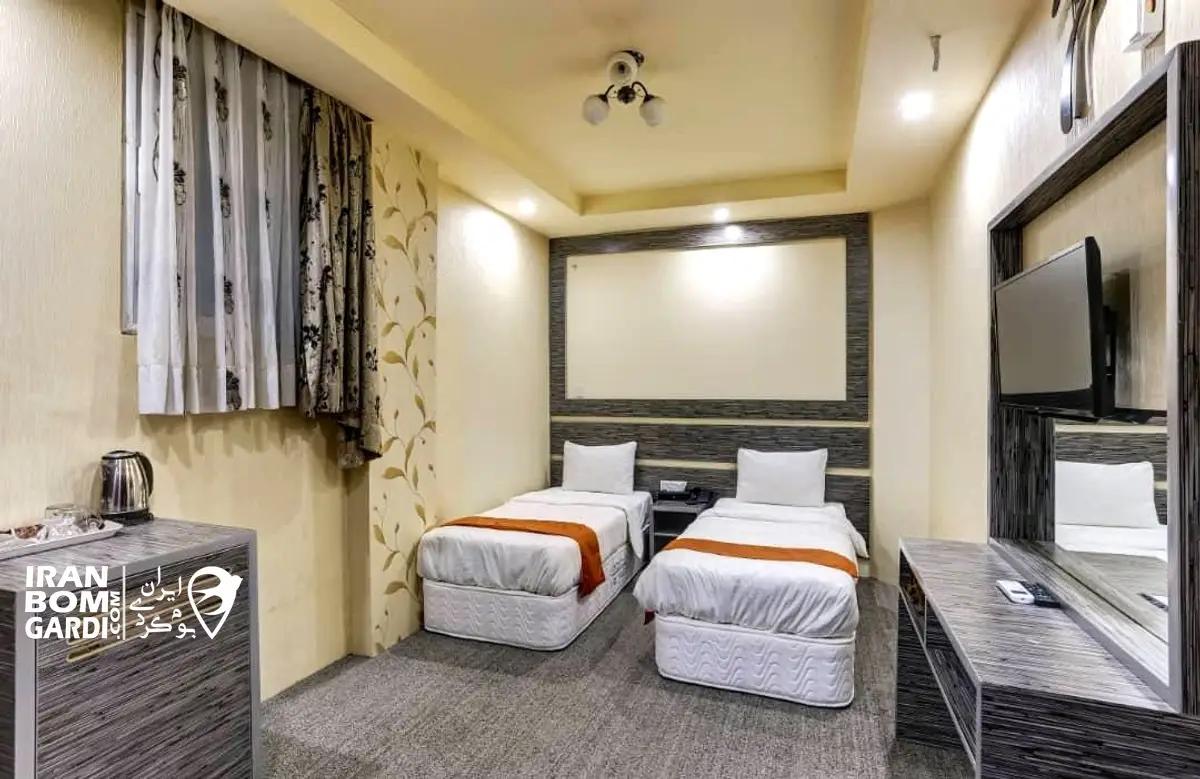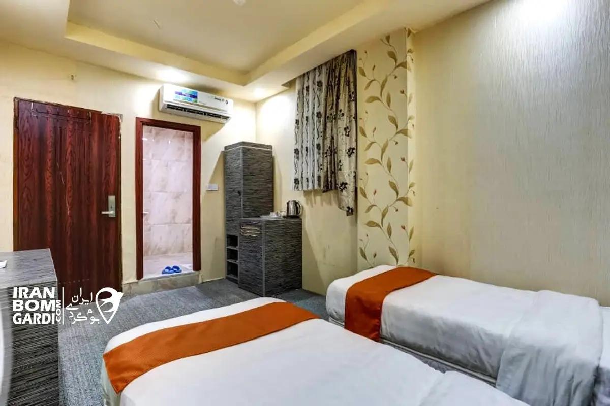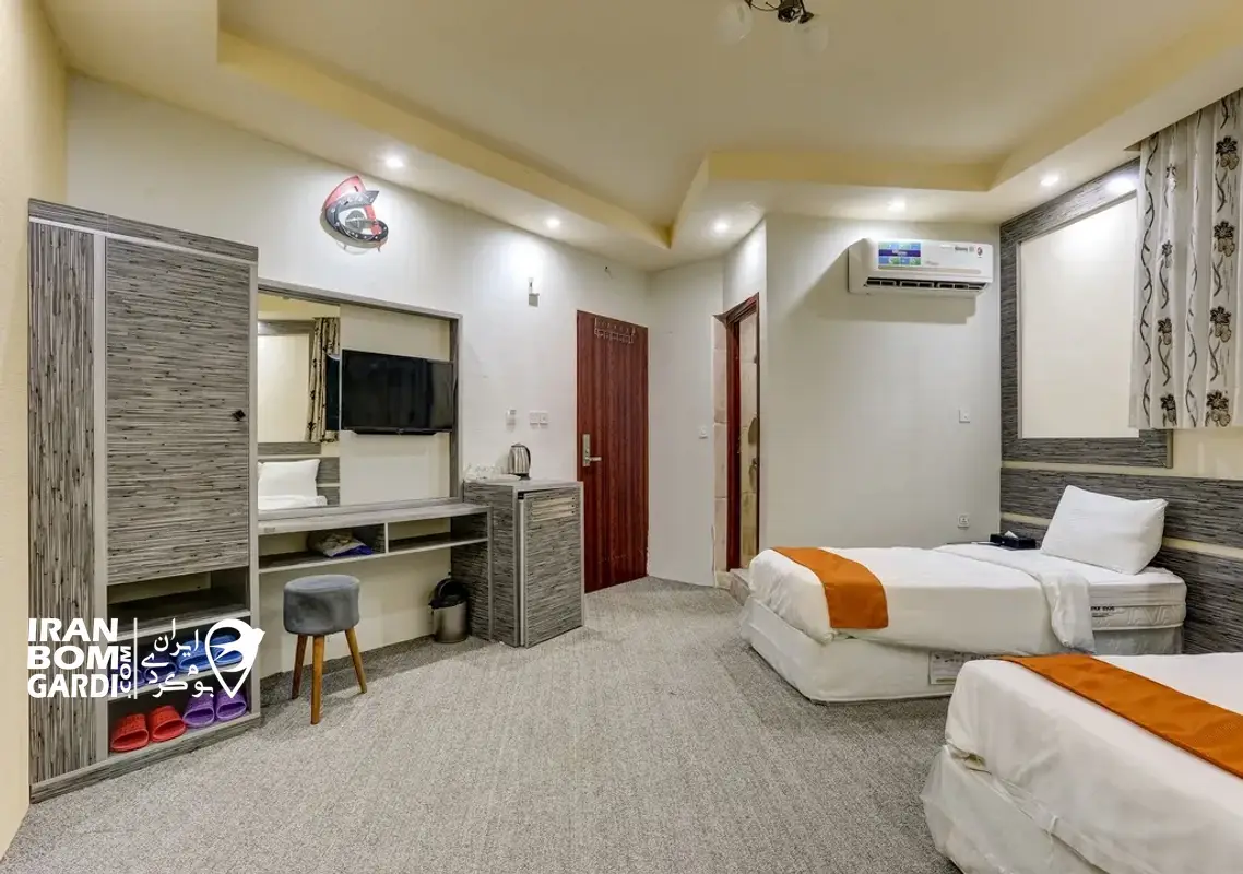 اتاق با زیربنای 20 متر در طبقه چهارم شامل 2 تخت سینگل، 1 سرویس کف خواب، تلویزیون، یخچال، چای ساز، سشوار، پک بهداشتی، سیستم سرمایشی کولر اسپلیت، بدلیل موقعیت جغرافیایی فاقد سیستم گرمایشی می باشد، سرویس بهداشتی ایرانی و حمام مشترک در راهرو.